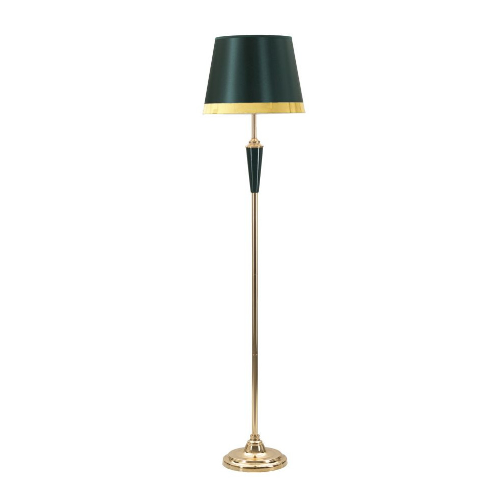Elegante piantana in metallo dorato con applicazioni verdi. Completa di paralume in tessuto beige con finiture dorate.