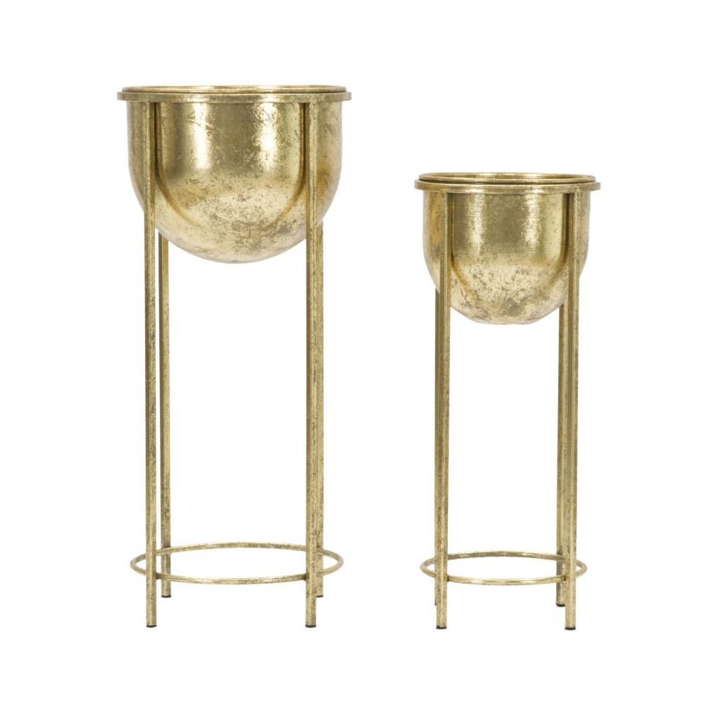 Coppia di fioriere in metallo dorato con basi. Le ciotole sono rimovibili per facilitare la pulizia. Un elemento lussuoso e glam per la tua casa