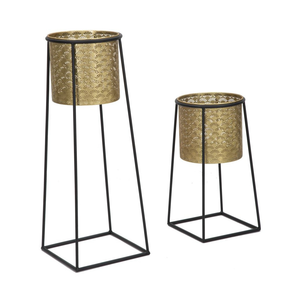 Elegante coppia di portavasi rotondi in metallo dorato intagliato con base in metallo nero. I portavasi sono rimovibili. Linee essenziali e intagli geometrici regalano un tocco di luce ed eleganza.