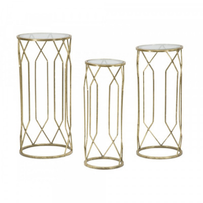 Tris di tavolinetti portatelefono in metallo e vetro. Il dorato abbinato al vetro crea un forte impatto. Un elemento lussuoso e glam per la tua casa