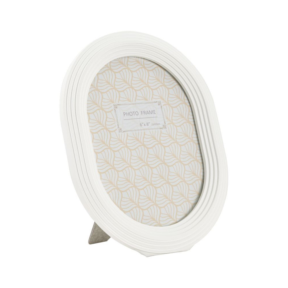 Cornice ovale da appoggio in resina bianca dal design semplice e lineare. Dimensioni foto cm 15x20.