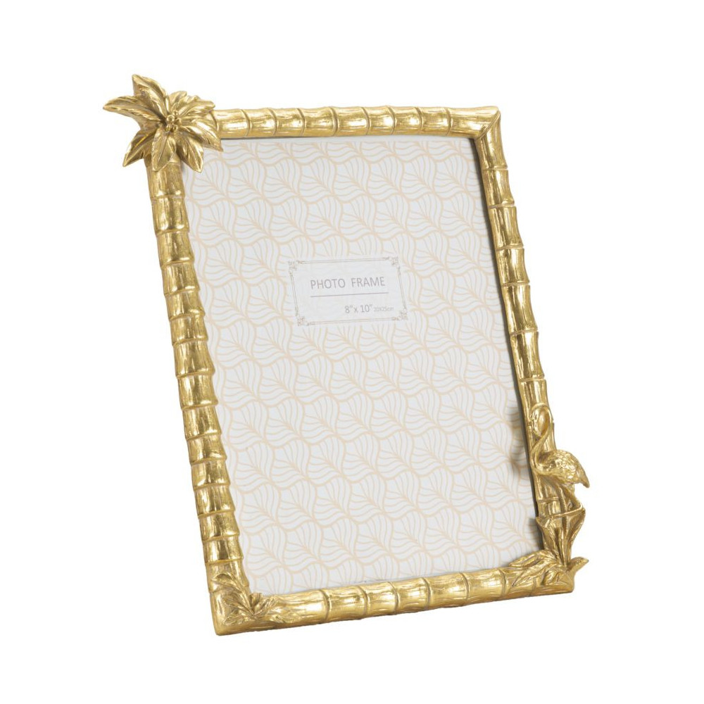 Cornice rettangolare da appoggio in resina dal design che ricorda le canne di bamboo e improziosita da un fiore e un fenicottero. Dimensioni foto cm 20x25.