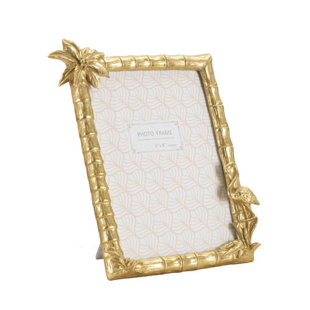 Cornice rettangolare da appoggio in resina dal design che ricorda le canne di bamboo e improziosita da un fiore e un fenicottero. Dimensioni foto cm 15x20.