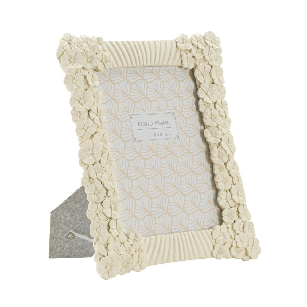 Cornice rettangolare da appoggio in resina dalle linee morbide e impreziosita da un insieme di fiorellini. Può essere posizionata sia in orizzontale che in verticale. Dimensioni foto cm 15x20.
