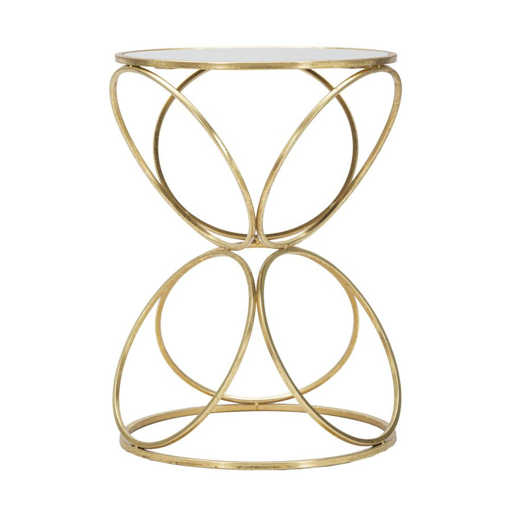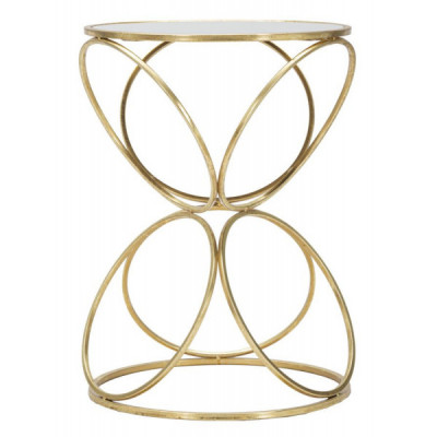 Elegante tavolinetto rotondo in metallo dorato con piano in vetro a specchio dalle linee morbide e sinuose. Il design che richiama una clessidra unito alla morbidezza delle linee creano un insieme unico che rende speciale ogni ambiente.