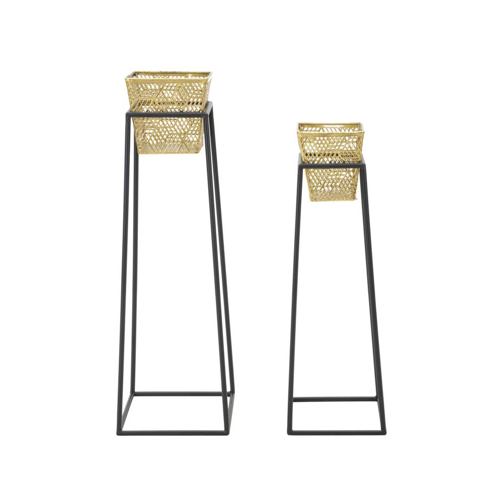 Coppia di portavasi in metallo dorato finemente intagliato con piedistalli in metallo nero. Le linee morbide e sinuose donano un tocco di armonia ad ogni ambiente.