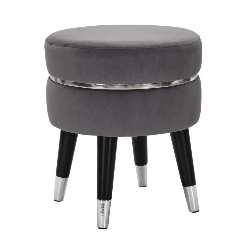 Sgabello in legno e velluto grigio. Sedute dalla finitura argento che si ispirano ai camerini delle grandi dive di Hollywood. Ideali da collocare in camera da letto o in salotto per sentirsi delle star.