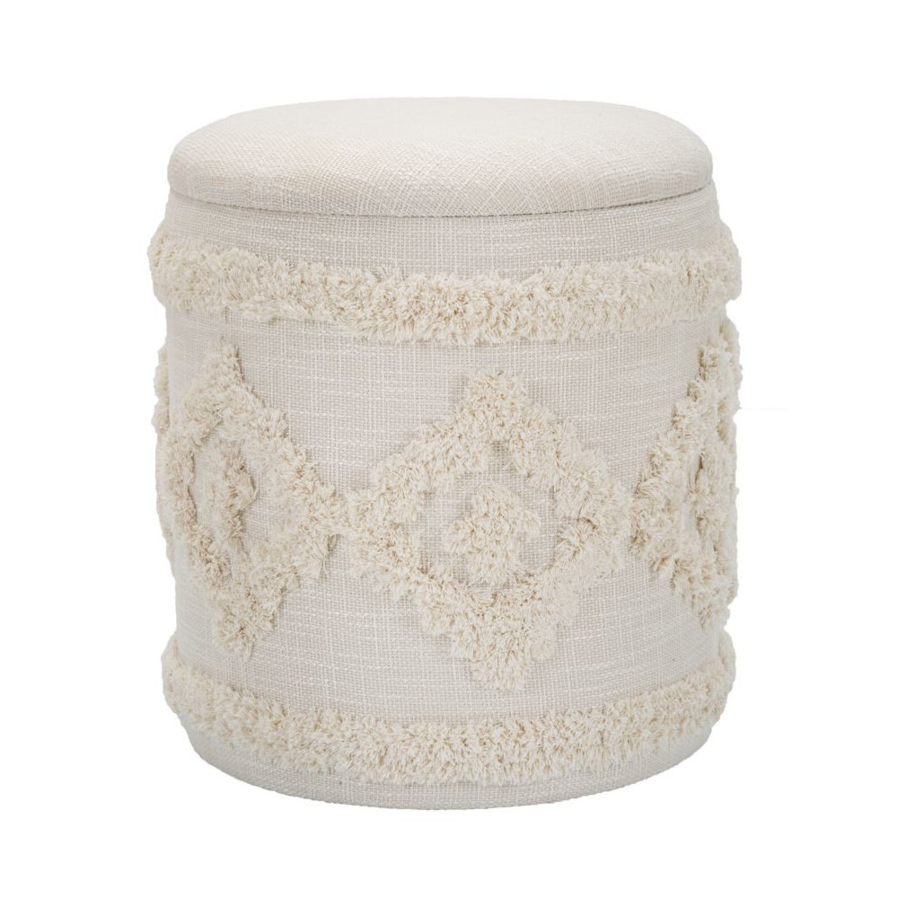 Pouf rotondo in tessuto imbottito elegantemente decorato, la seduta si apre rivelando un pratico contenitore.