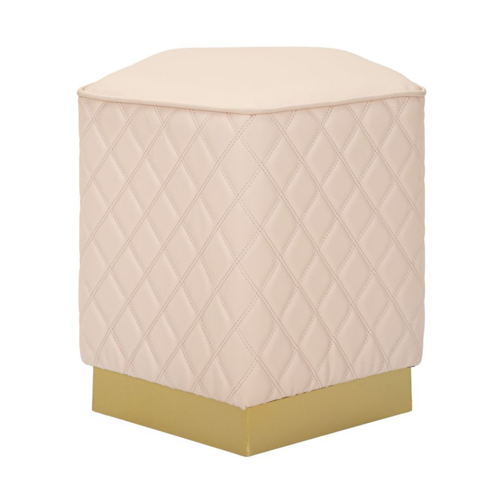 Pouff pentagonale rosa trapuntato in simil pelle con base oro aggiunge un tocco di luminosità a qualsiasi spazio.