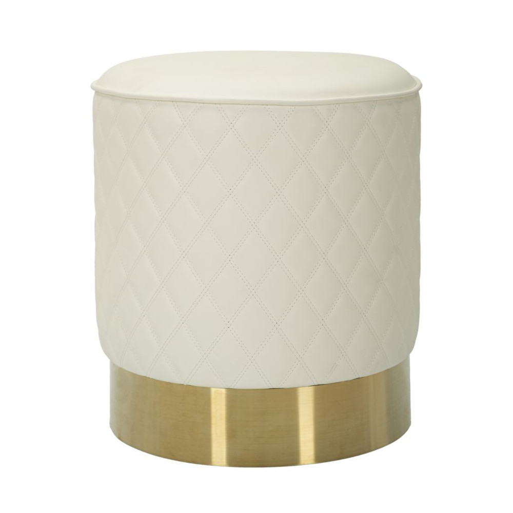 Pouff rotondo bianco trapuntato in simil pelle con base oro aggiunge un tocco di luminosità a qualsiasi spazio.