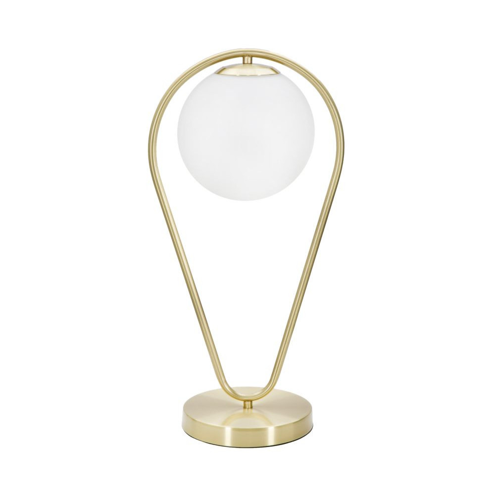Lampada da tavolo in metallo dorato con sfera in vetro bianco. Le linee essenziali che ricordano una mongolfiera si sposano con l'eleganza dell'oro per creare una combinazione unica.