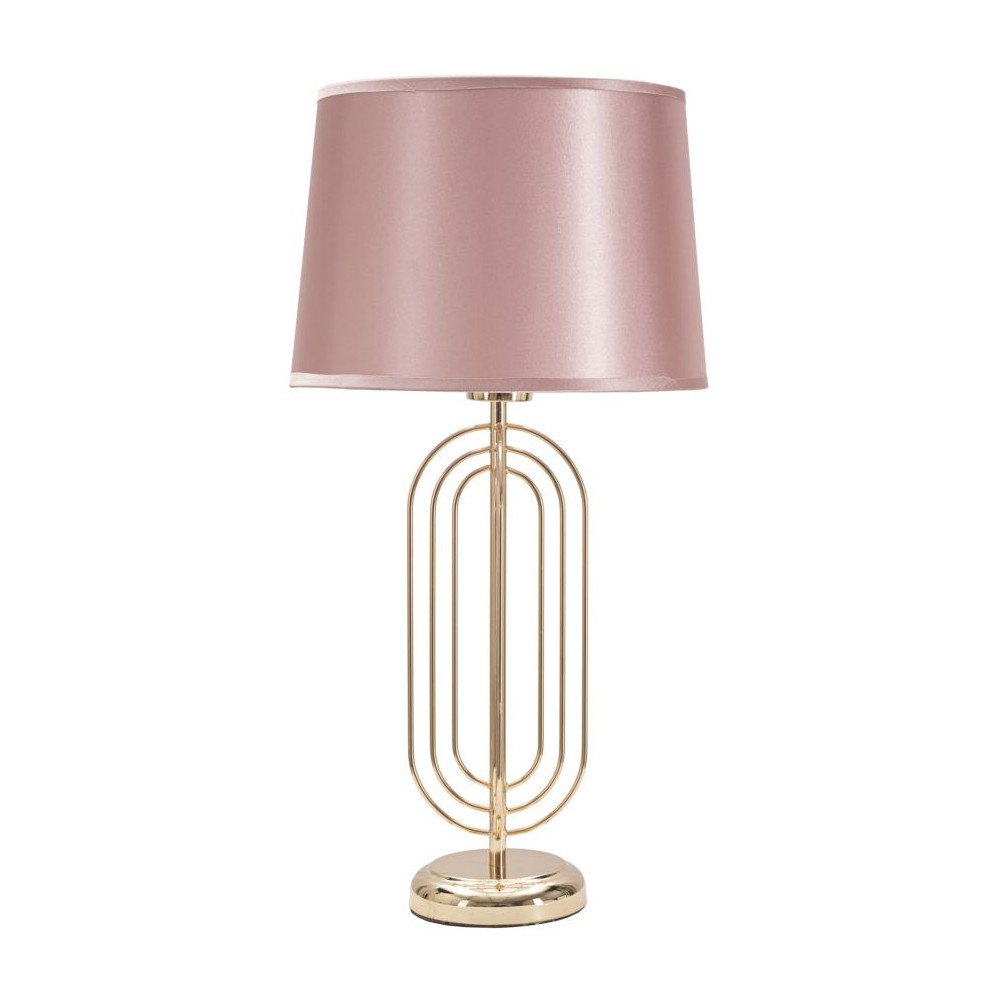 Elegante lampada da tavolo in stile glam in metallo dorato e paralume in tessuto rosa. I decori metallici dalle linee geometriche e pulite donano un tocco di classe ad ogni tipo di arredo.