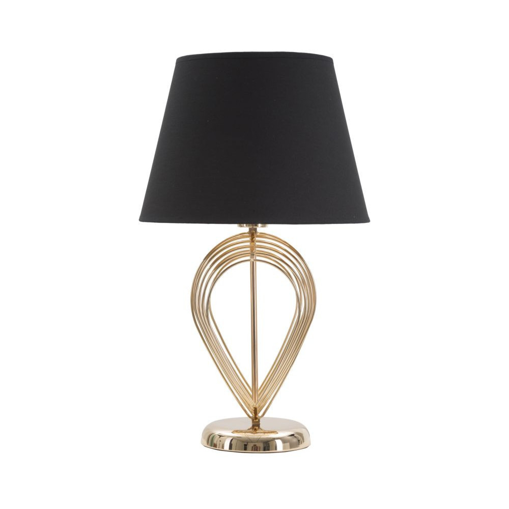 Lampada da tavolo in metallo dorato con paralume in tessuto nero. La lavorazione della base, semplice ed elegante, ed il contrasto tra il nero e l'oro donano un tocco di raffinatezza ad ogni ambiente.