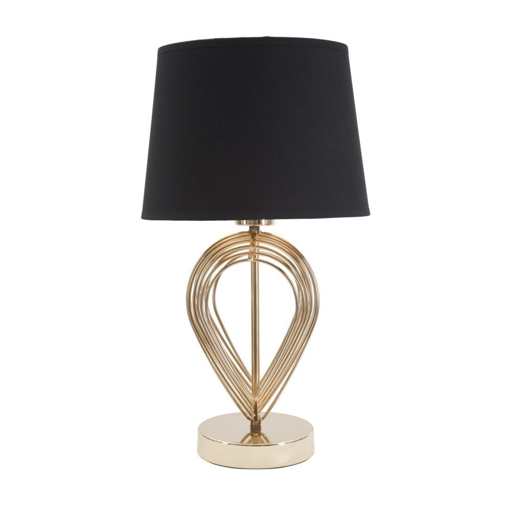 Lampada da tavolo in metallo dorato con paralume in tessuto nero. La lavorazione della base, semplice ed elegante, ed il contrasto tra il nero e l'oro donano un tocco di raffinatezza ad ogni ambiente.