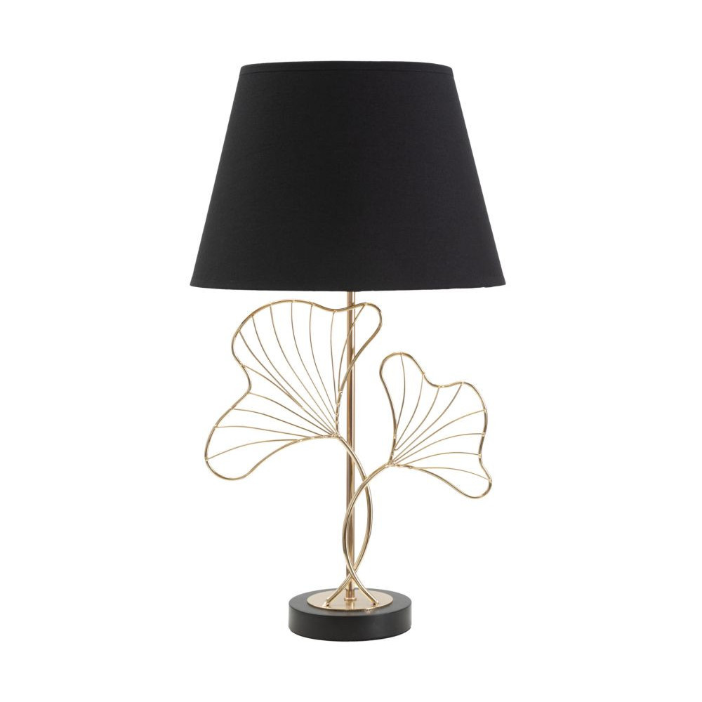 Lampada da tavolo in metallo dorato con base e paralume in tessuto nero. L'elegante decorazione richiama delle foglie. L'unione tra l'oro e il nero creano un perfetto contrasto adatto ad ogni ambiente.