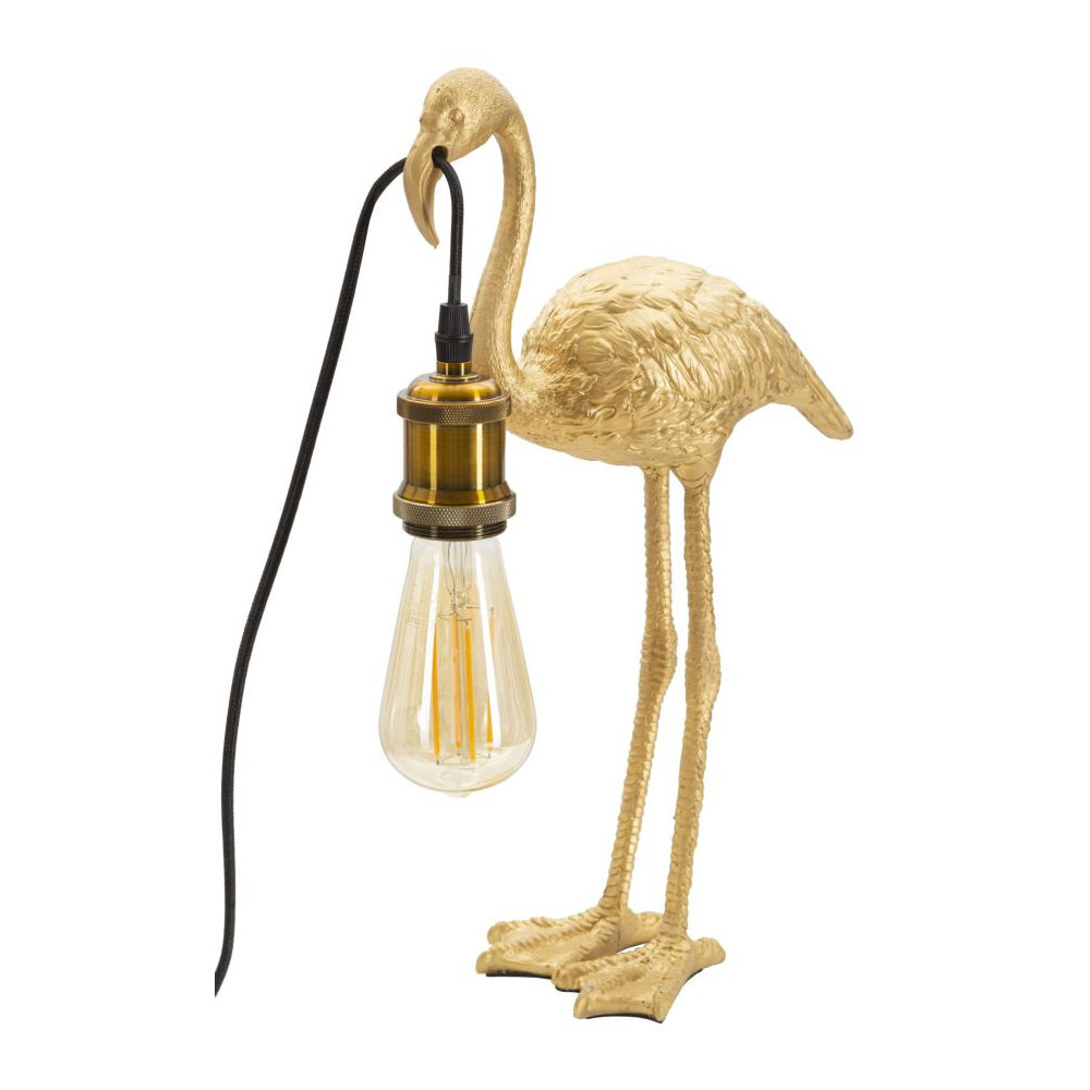 Lampada da tavolo in resina dorata raffigurante un simpatico fenicottero che tiene il cavo della lampadina con il becco. Un tocco di allegria da abbinare ad ogni tipo di arredamento.