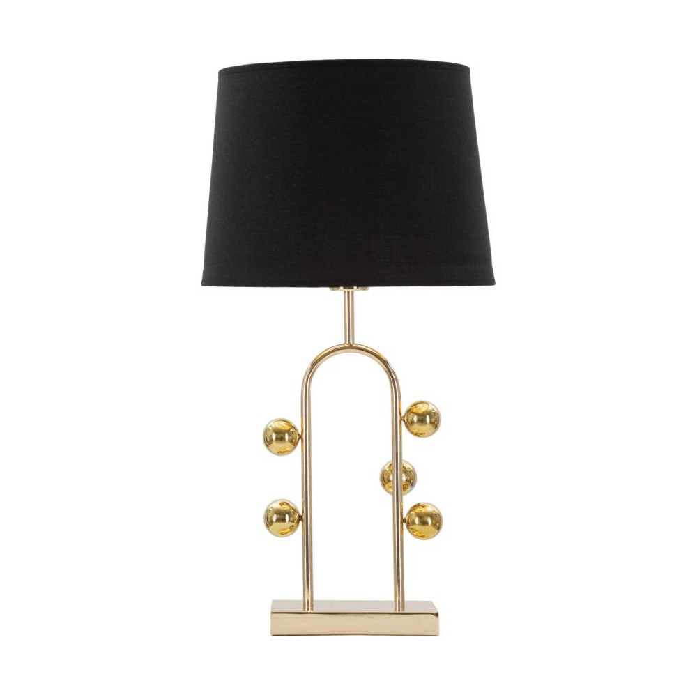 Lampada da tavolo in metallo dorato dal particolare design lineare impreziosito da sfere decorative e paralume in tessuto nero.