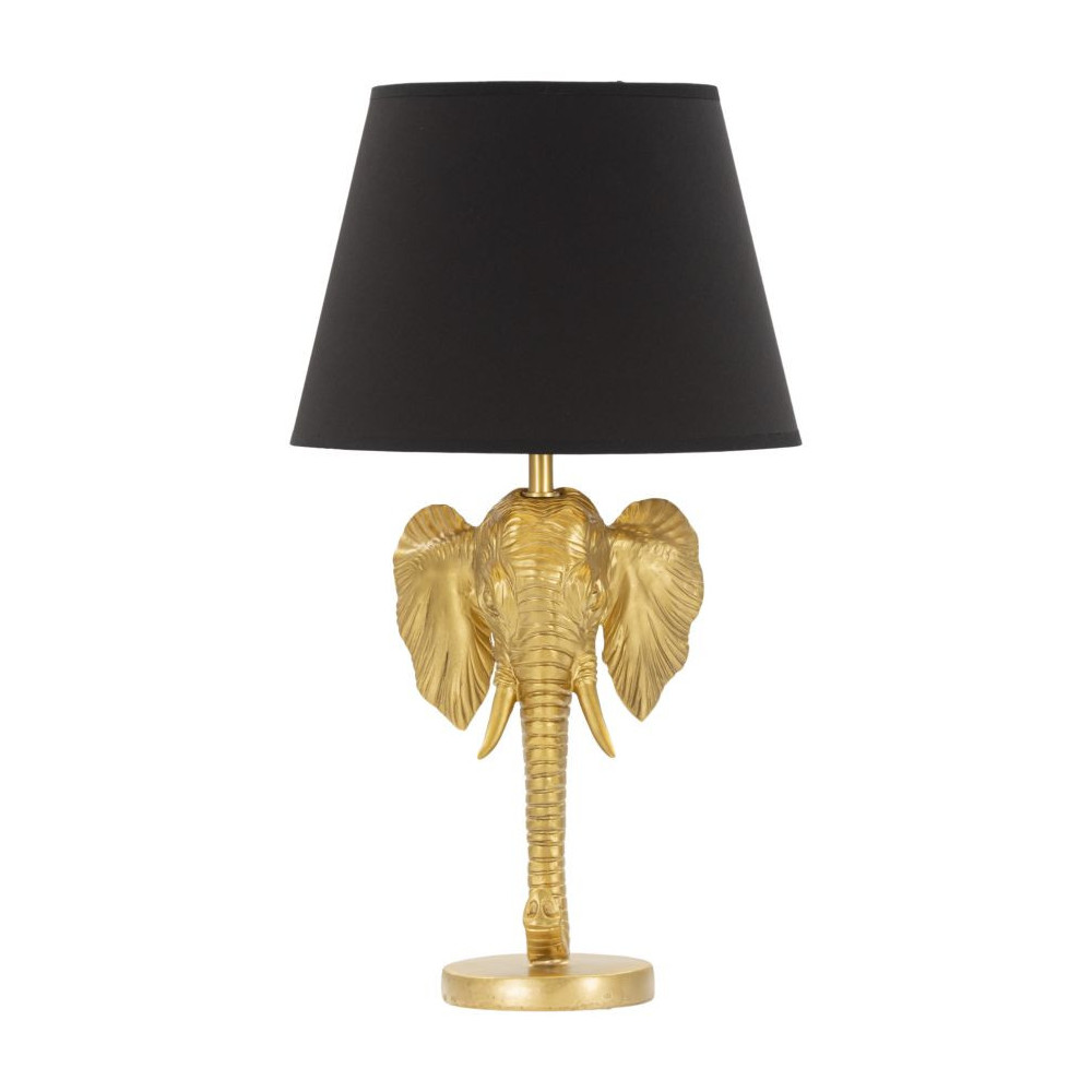 Lampada da tavolo in metallo nero con testa di elefante dorato decorativo con parlume in tessuto nero.