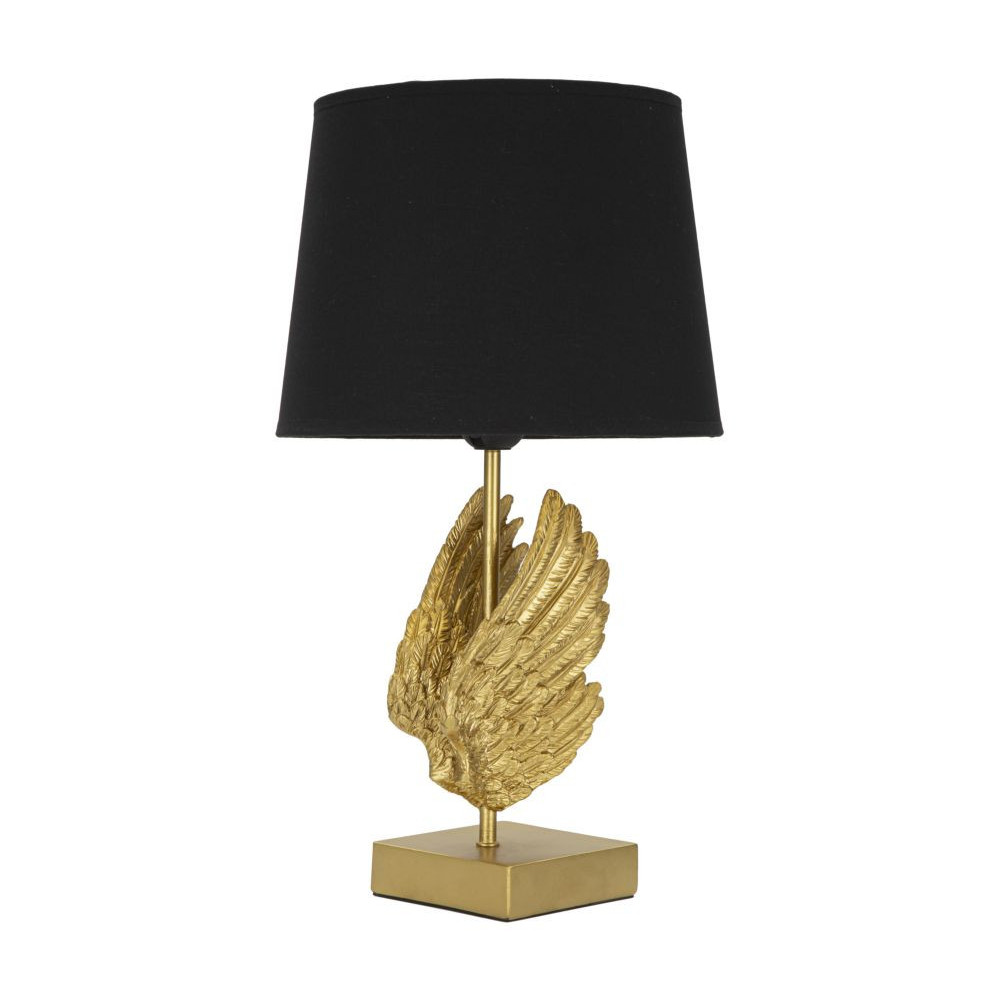 Lampada da tavolo in metallo e resina impreziosita da una coppia di ali che ricordano quelle di un cigno. Completa di paralume in tessuto nero.
