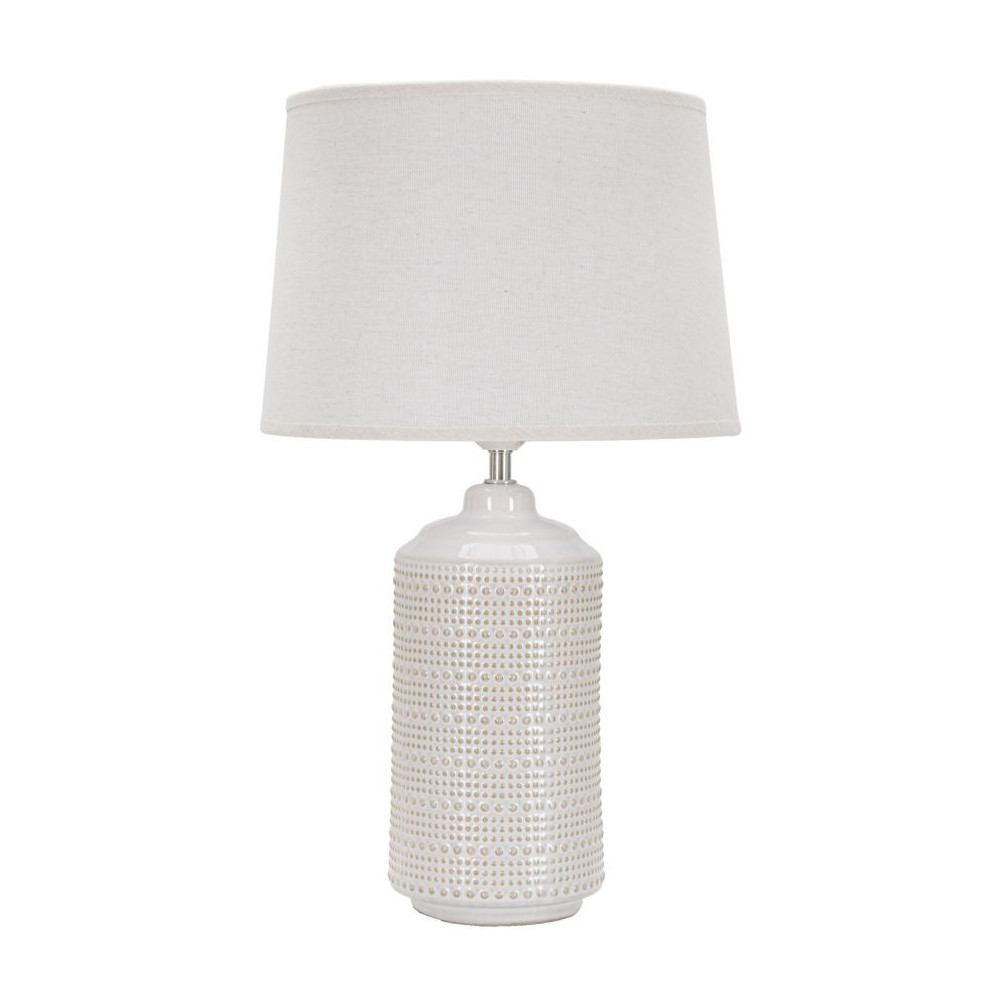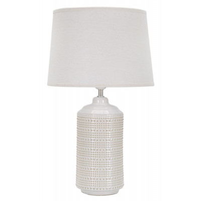 Lampada da tavolo in ceramica con eleganti decorazioni in rilievo. Completa di paralume in tessuto bianco.