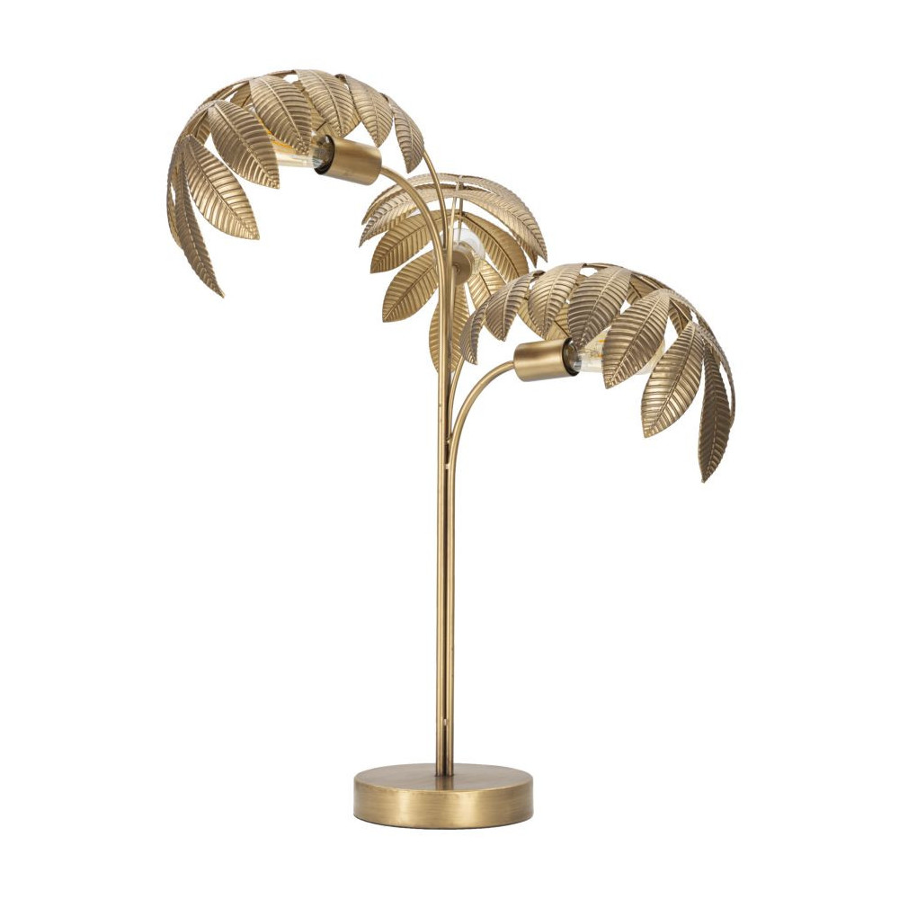 Lampada da tavolo in metallo dorato con 3 punti luce, con base rotonda dal design ispirato alle foglie esotiche.