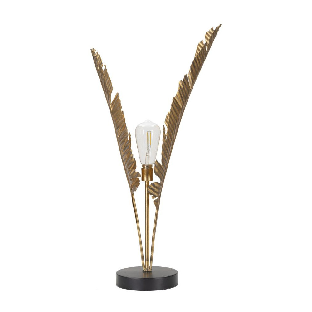 Lampada da tavolo in metallo dorato con base rotonda dal design ispirato alle foglie di palma.