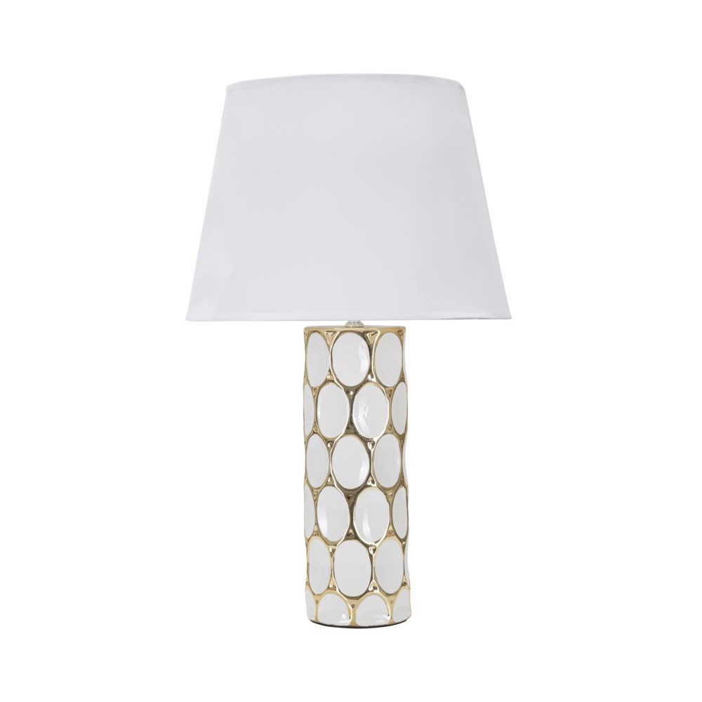Lampada da tavolo in ceramica bianca e dorata con eleganti decorazioni geometriche in rilievo. Completa di paralume in tessuto bianco.
