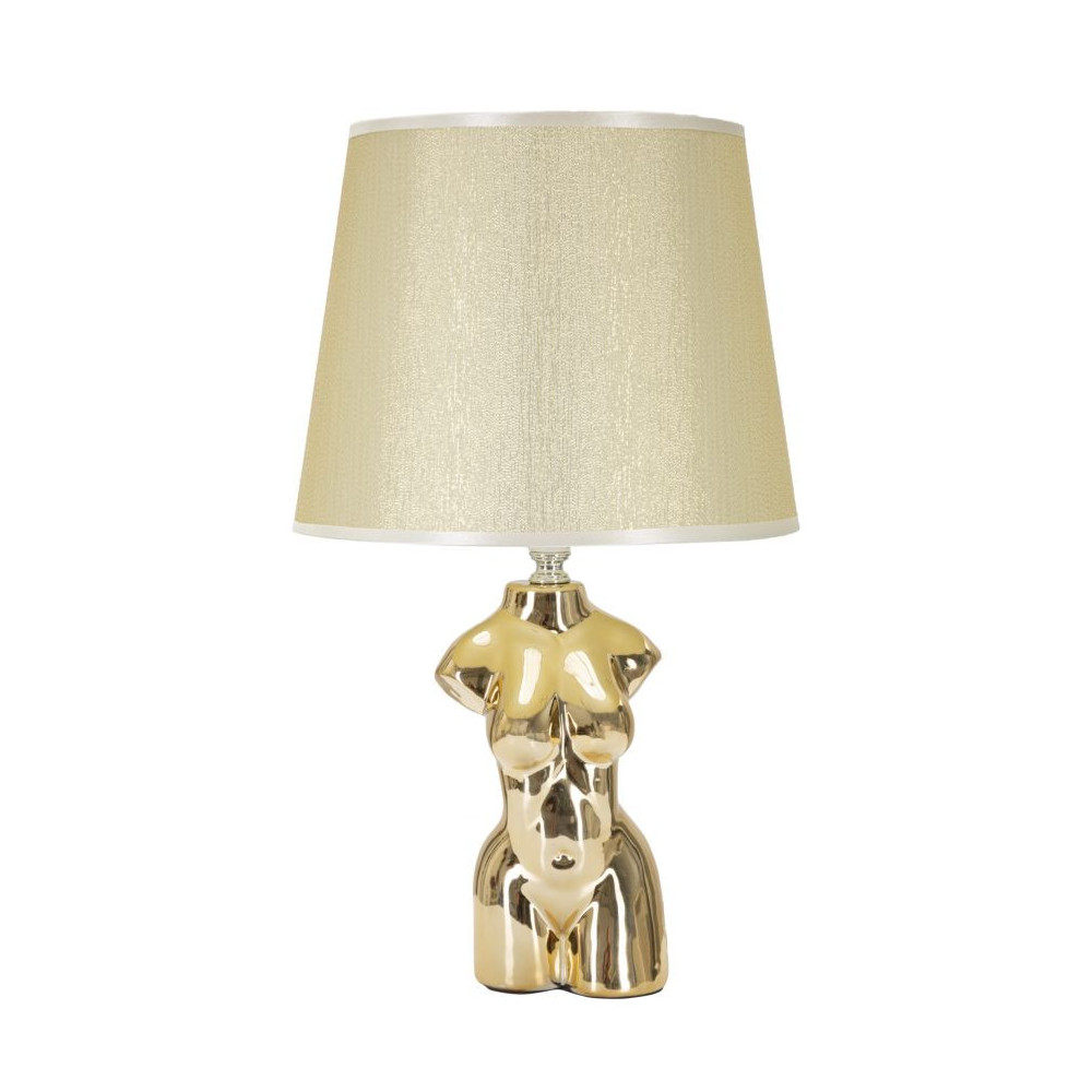 Lampada da tavolo in ceramica dorata a forma di busto di donna. Completa di paralume in tessuto beige.