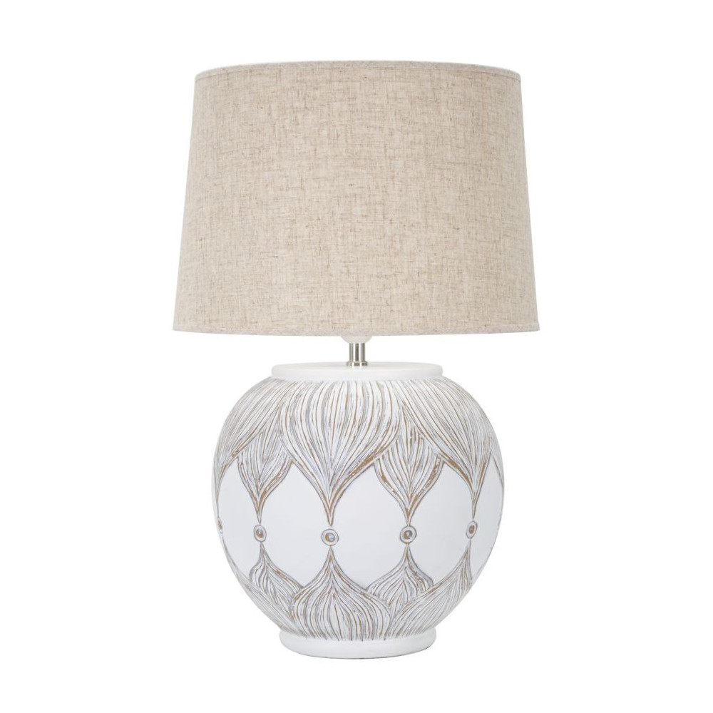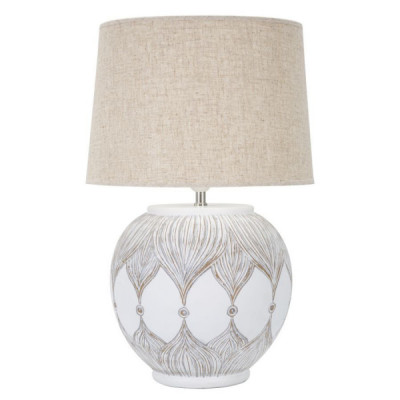 Lampada da tavolo in resina con eleganti decorazioni lineari che richiamano delle foglie. Completa di paralume in tessuto beige.