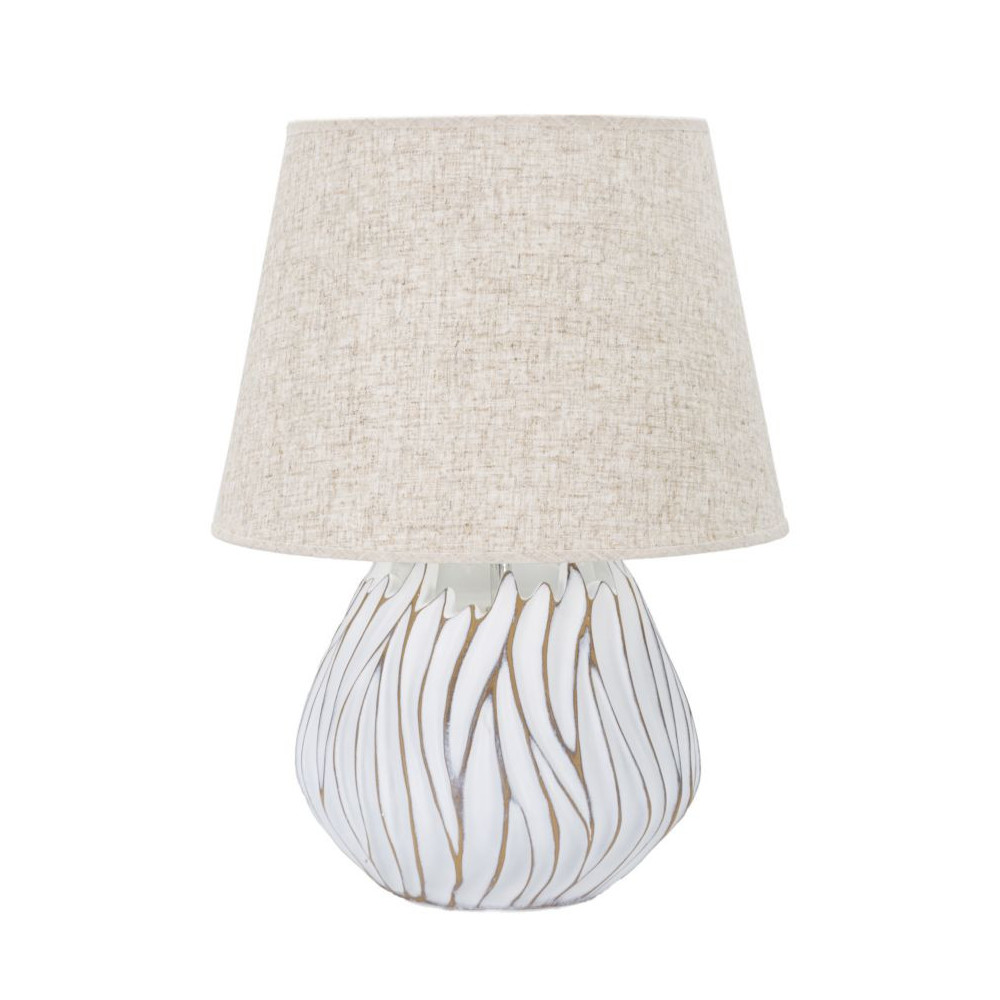Lampada da tavolo in resina con eleganti decorazioni lineari in rilievo. Completa di paralume in tessuto beige.
