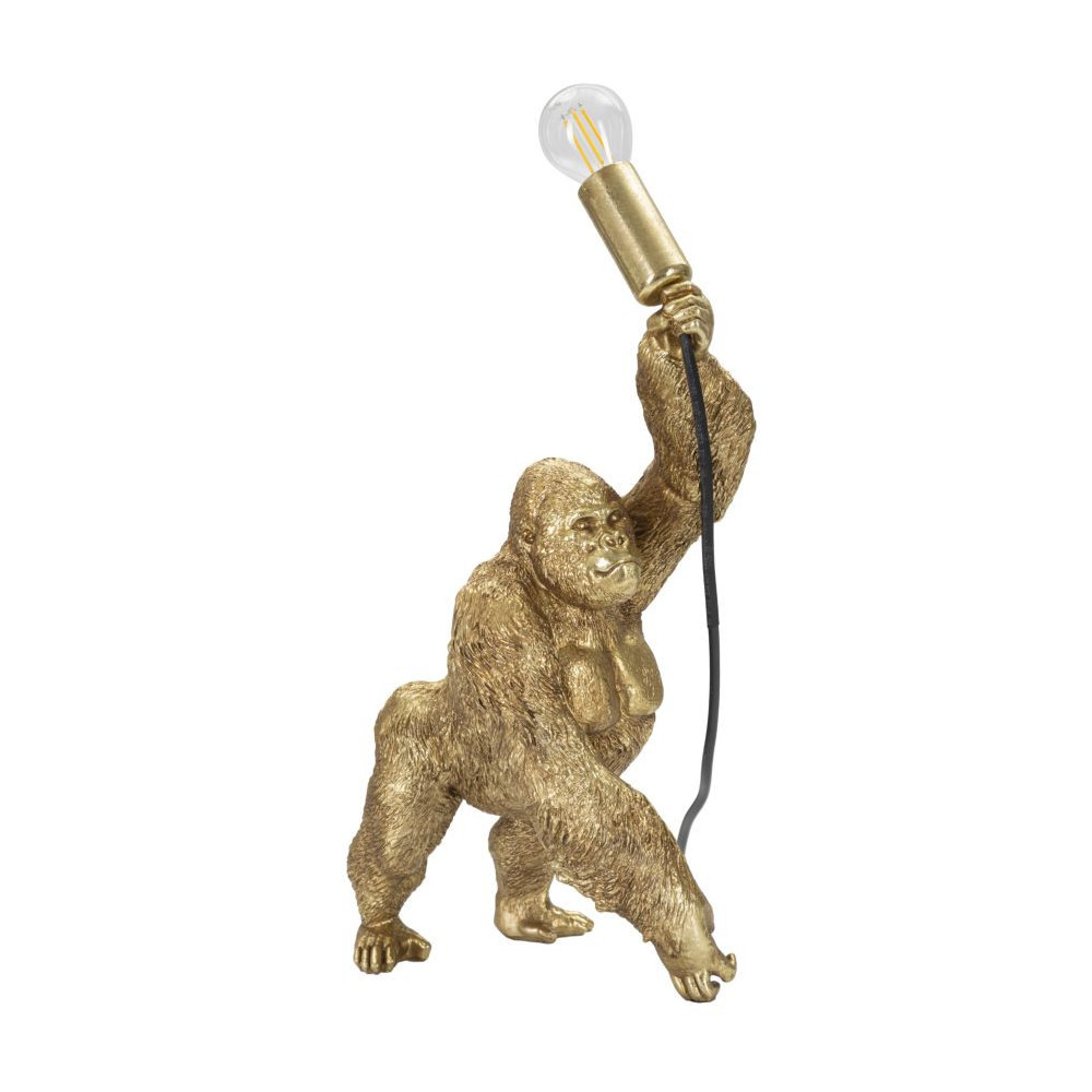 Lampada da tavolo in resina dorata a forma di gorilla che tiene in mano la lampadina.