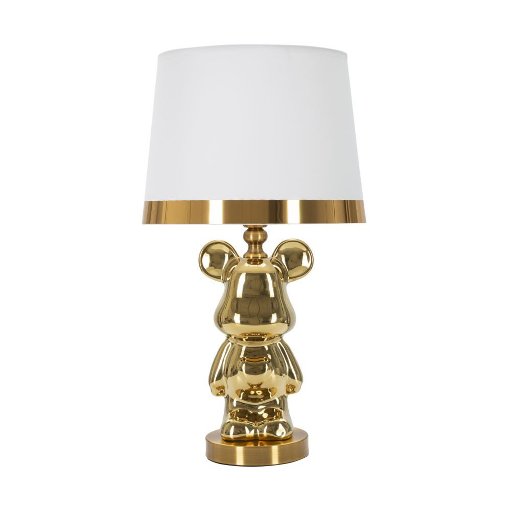 Lampada da tavolo in ceramica dorata a forma di simpatico orsacchiotto con base rotonda. Completa di paralume in tessuto beige con elegante fascia dorata.