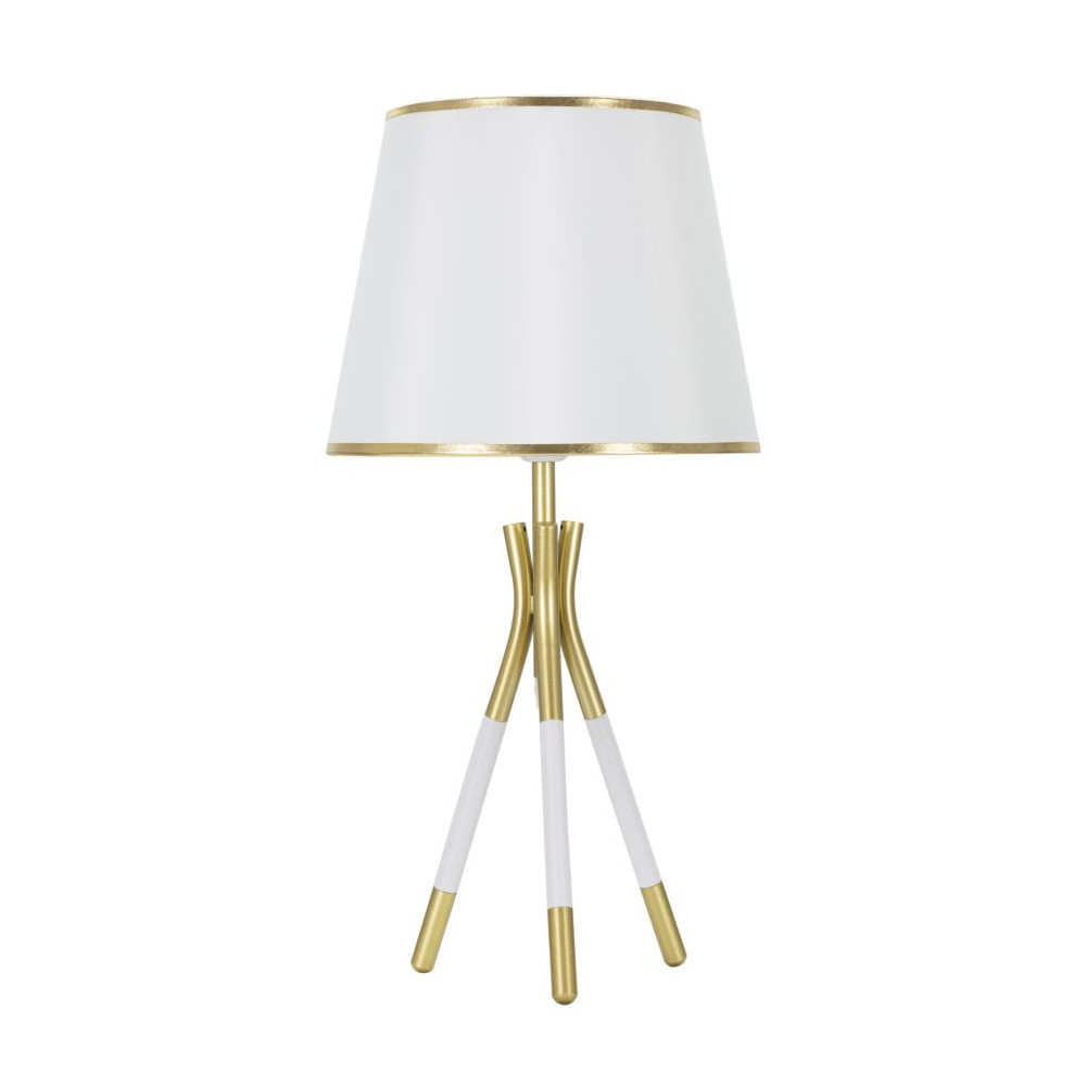 Lampada da tavolo in metallo bianco e dorata composta da tre aste che si intersecano. Completa di paralume in tessuto bianco con bordi dorati.