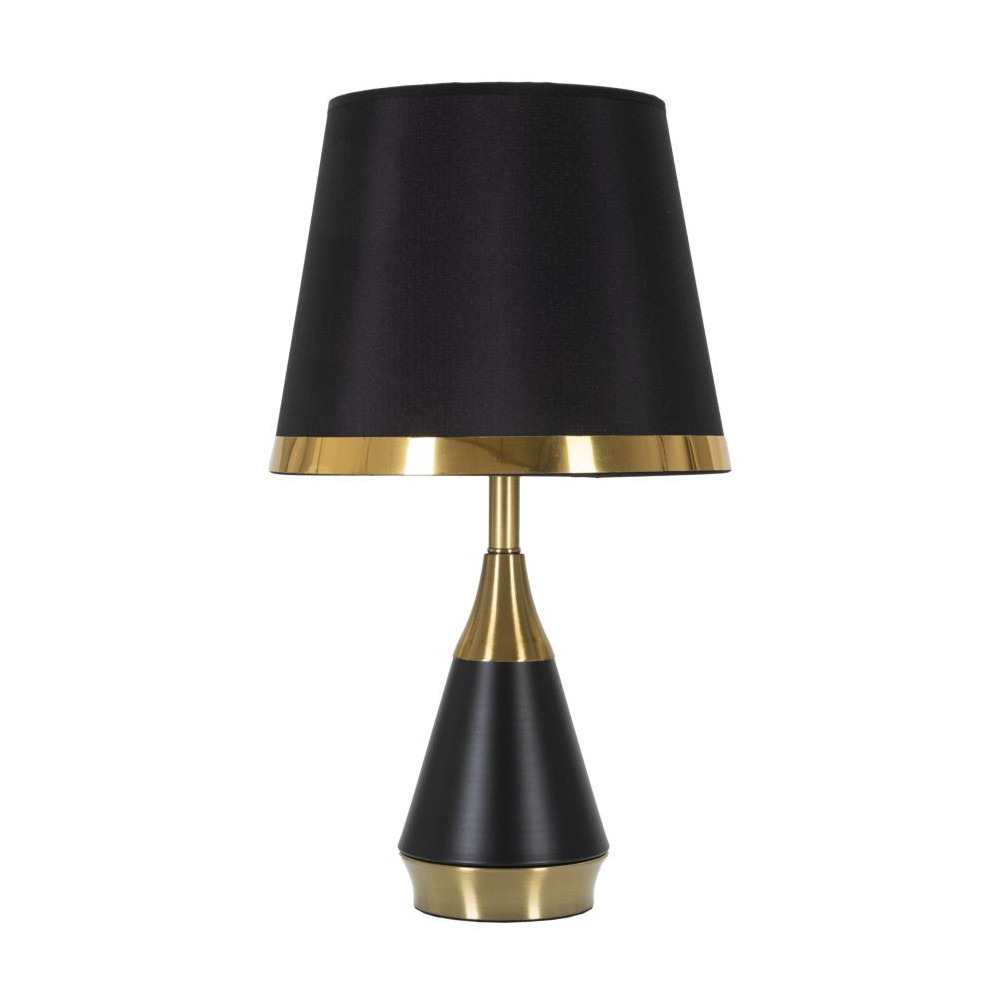 Lampada da tavolo in metallo nero e dorato dal design semplice ed essenziale. Completa di paralume in tessuto nero con bordi dorati.