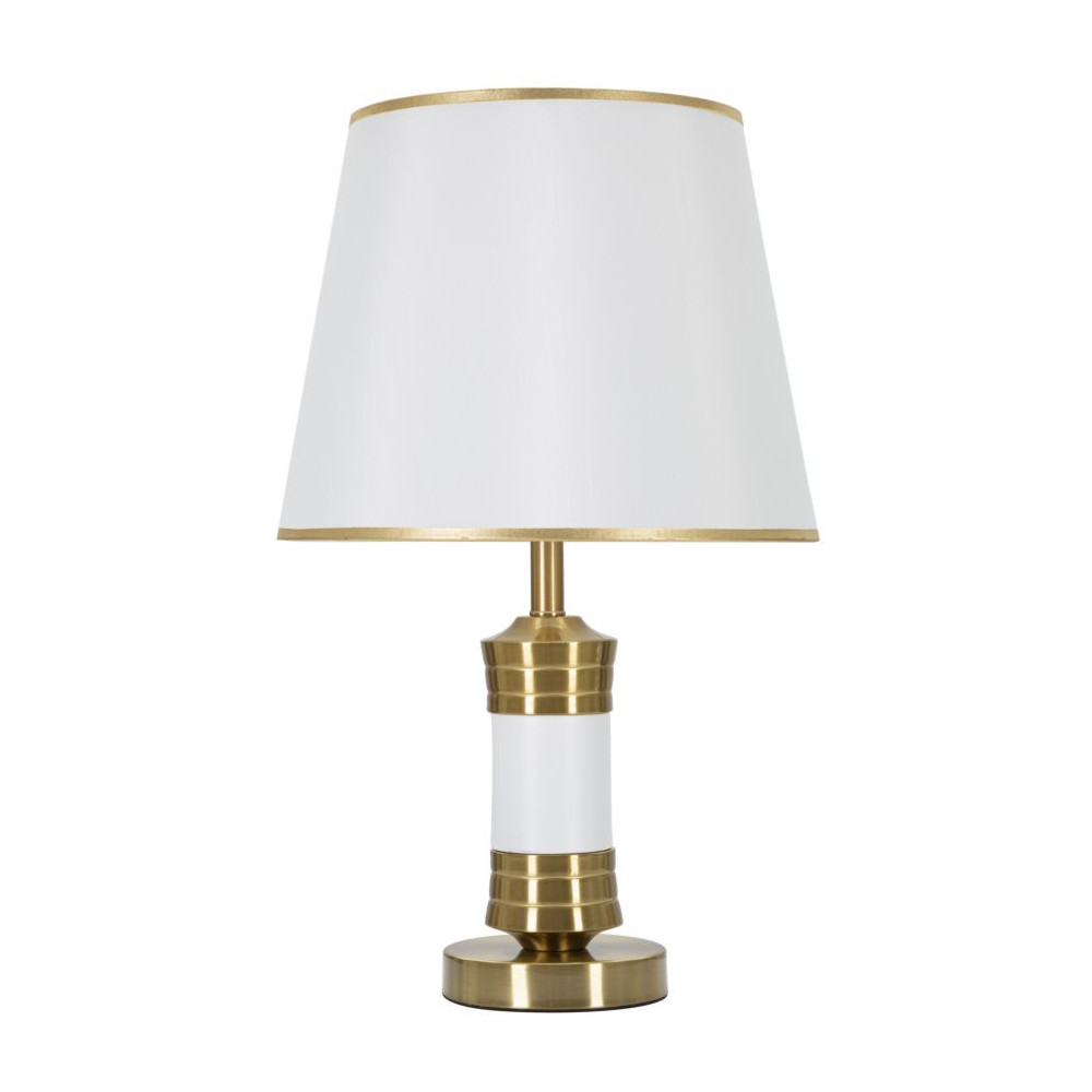 Lampada da tavolo in metallo dorato con elegante decorazione bianca e con base rotonda. Completa di paralume in tessuto bianco con bordi dorati.