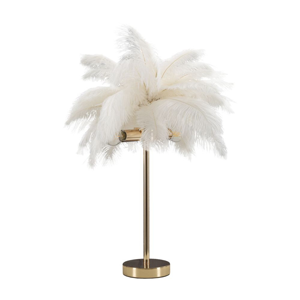 Lampada da tavolo in metallo dorato con 2 punti luce e paralume composto da piume bianche.