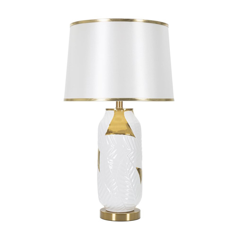 Lampada da tavolo in ceramica bianca e dorata decorata con eleganti foglie completa di paralume in tessuto bianco con bordi dorati.