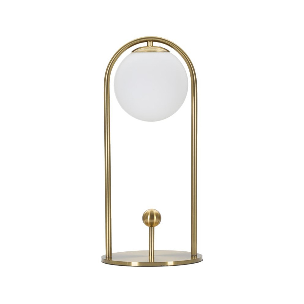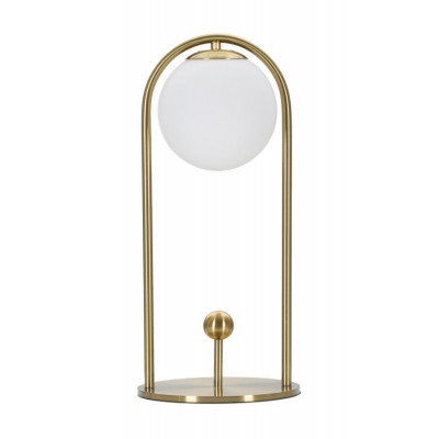 Lampada da tavolo in metallo dorato dalle linee semplici con elegante sfera paralume in vetro bianco.