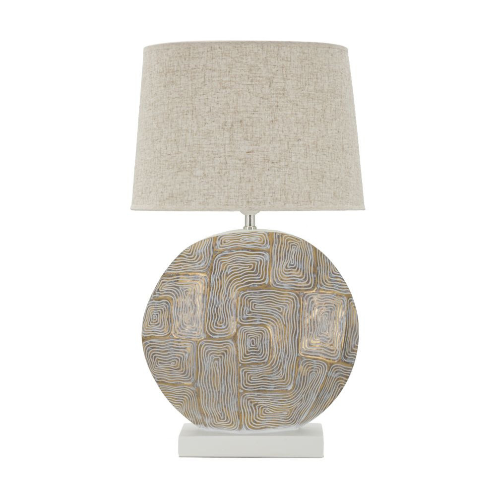 Lampada da tavolo in resina con eleganti decorazioni geometriche in rilievo. Completa di paralume in tessuto beige.