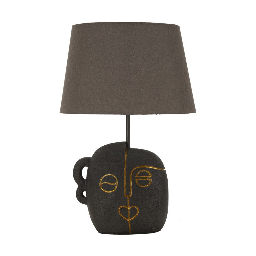 Lampada da tavolo in resina dalla forma ispirata ad un volto tribale impreziosita da tratti dorati. Completa di paralume in tessuto grigio.