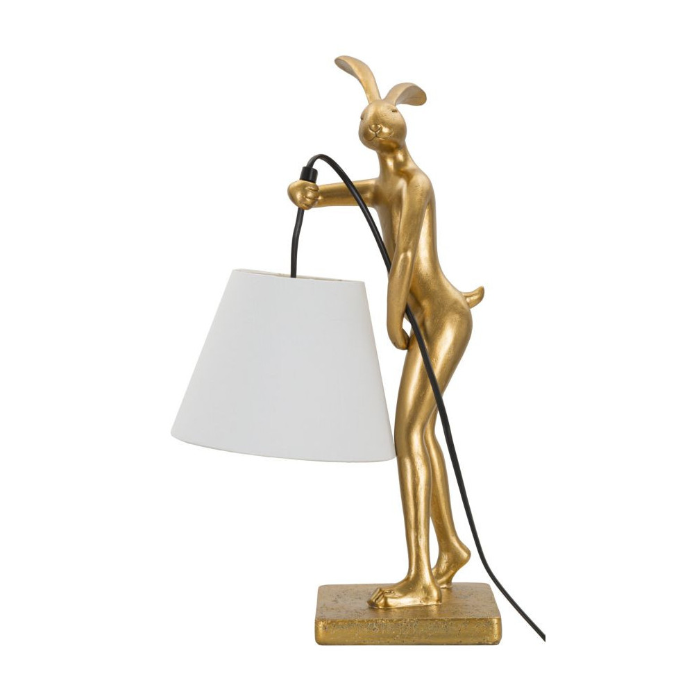 Lampada da tavolo in resina dorata a forma di coniglio che tiene in mano il paralume in tessuto bianco.