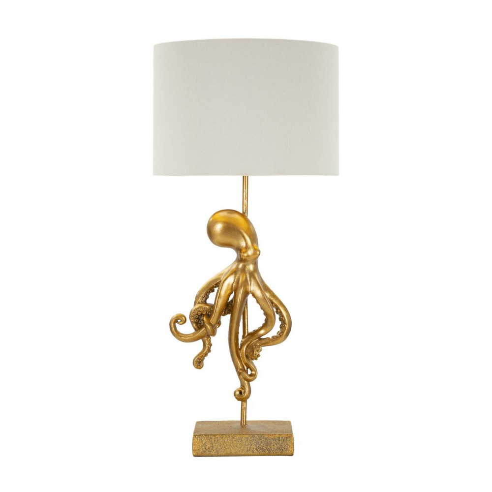 Lampada da tavolo in resina dorata a forma di polipo. Completa di paralume in tessuto bianco.