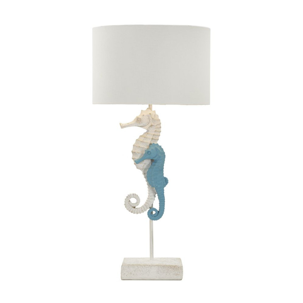 Lampada da tavolo in resina impreziosita da due simpatici cavallucci marini. Completa di paralume in tessuto bianco.