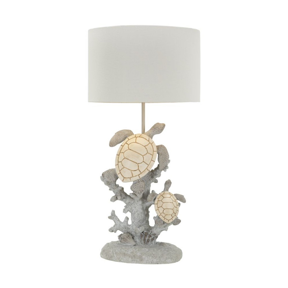 Lampada da tavolo in resina impreziosita da simpatiche tartarughe marine. Completa di paralume in tessuto beige.