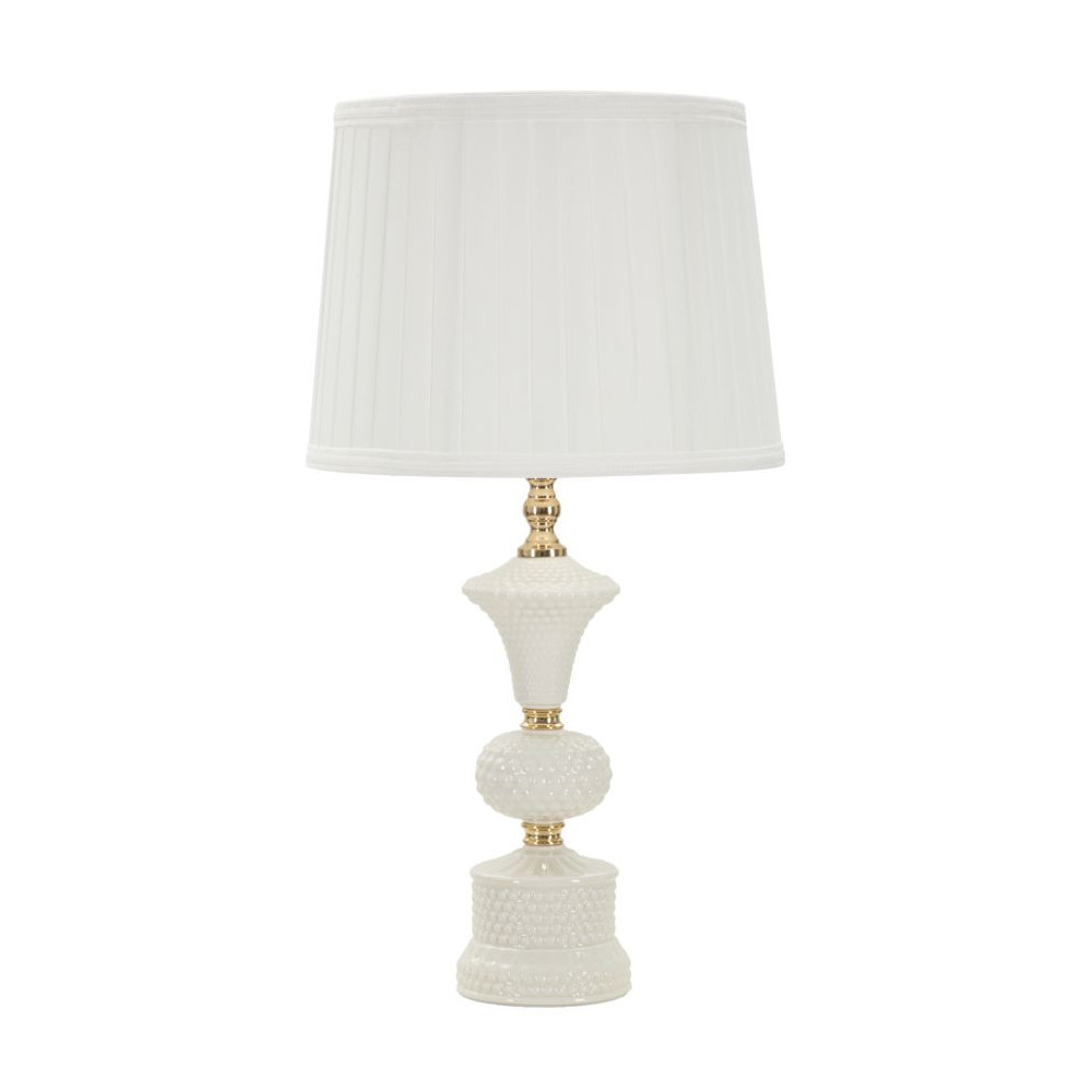Lampada in ceramica bianca con rifiniture dorate dal design semplice ed elegante. Completa di paralume in tessuto bianco.