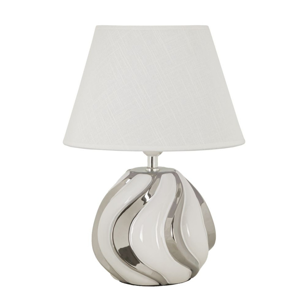 Lampada in ceramica bianca con rifiniture argentate dal design semplice ed elegante. Completa di paralume in tessuto bianco.