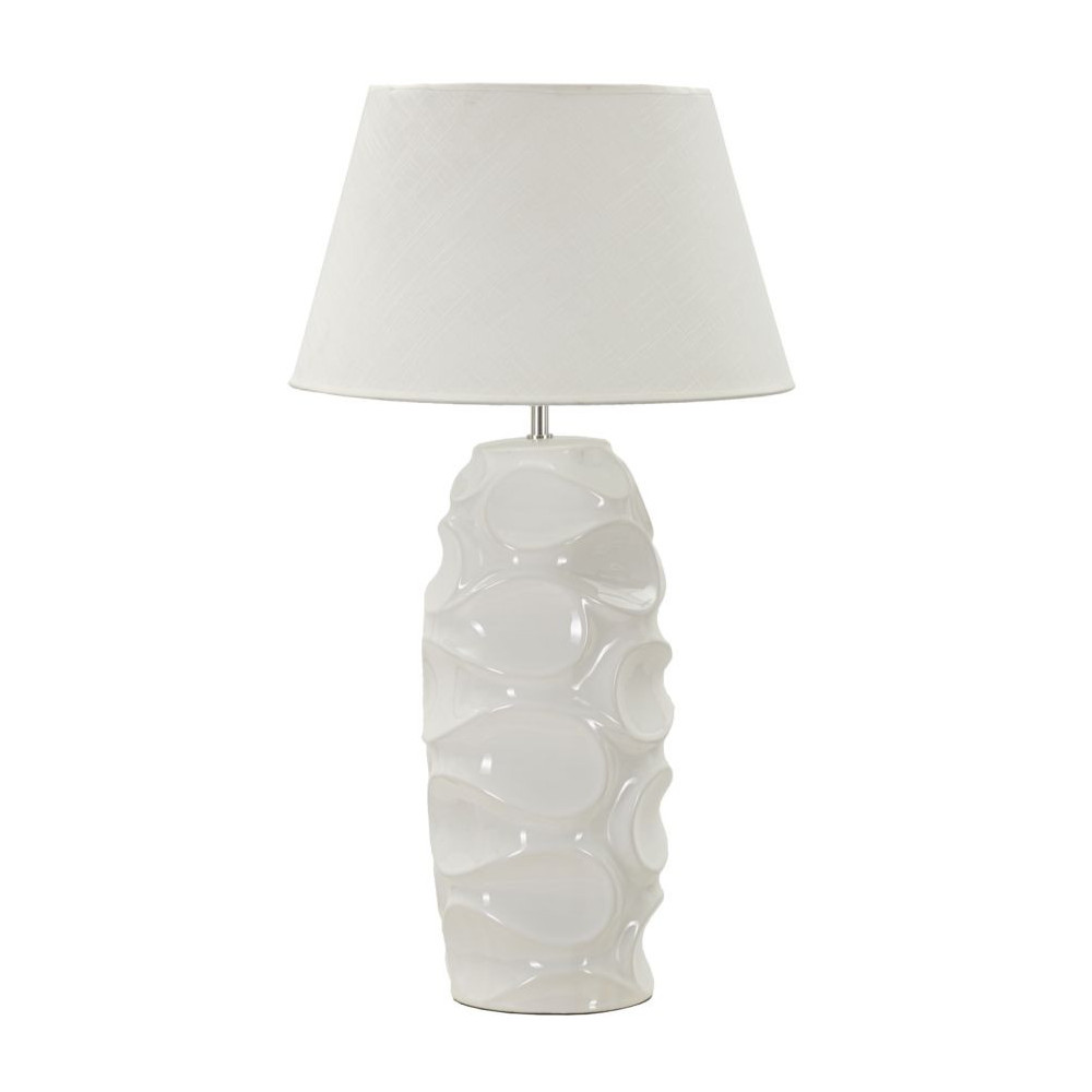 Lampada in ceramica bianca dalle forme morbide e arrotondate. Completa di paralume in tessuto bianco.