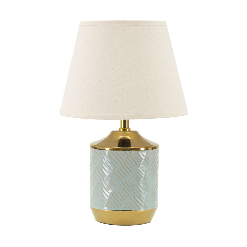 Lampada in ceramica celeste con rifiniture dorate dal design semplice ed elegante. Completa di paralume in tessuto bianco.