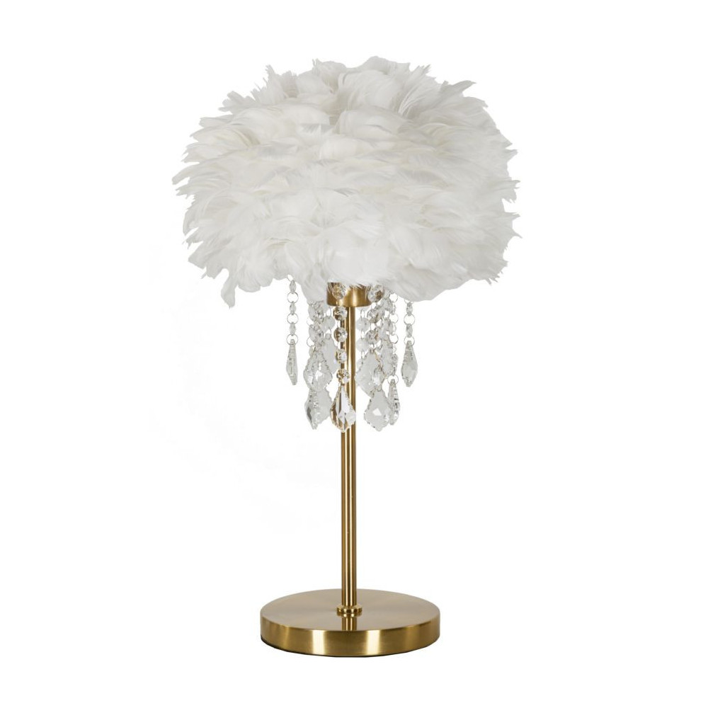 Lampada da tavolo in metallo dorato dal design lineare completa di elegante paralume composto da piume sintetiche e impreziosito da cristalli.