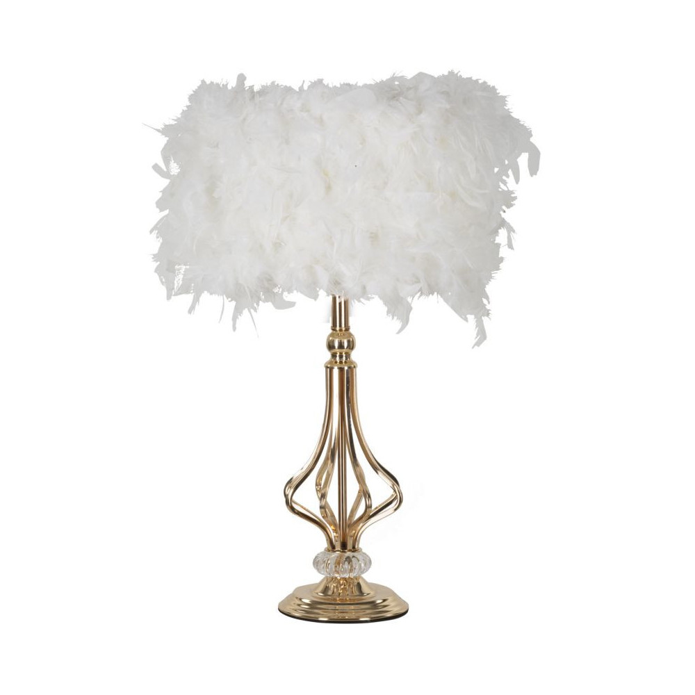Lampada da tavolo in metallo dorato dal design design geometrico, completo di paralume con eleganti piume sintetiche.